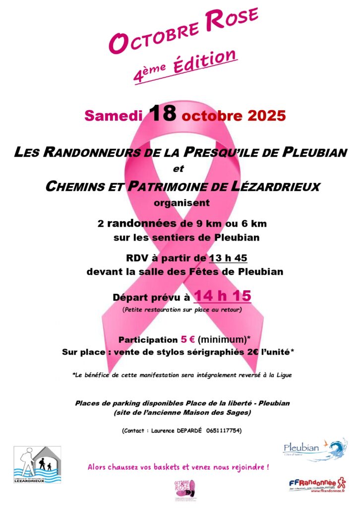 Dans le cadre d’Octobre Rose, participez aux marches roses qui seront organisées à Pleubian le samedi 18 octobre, avec la participation du club affilié Les randonneurs de la Presqu’île.