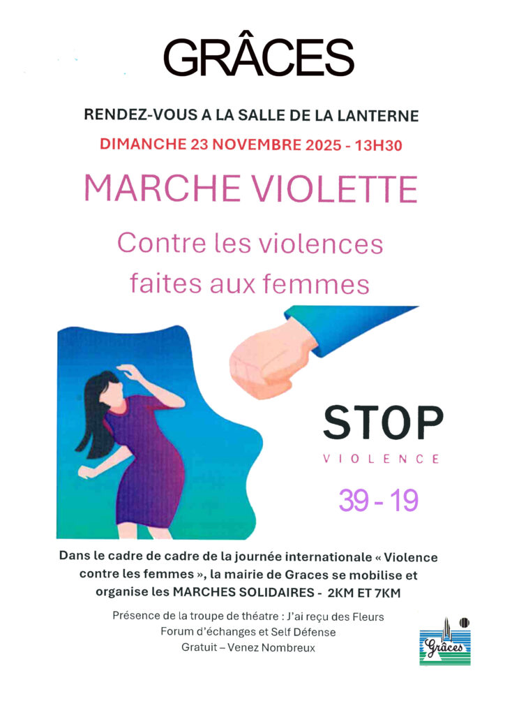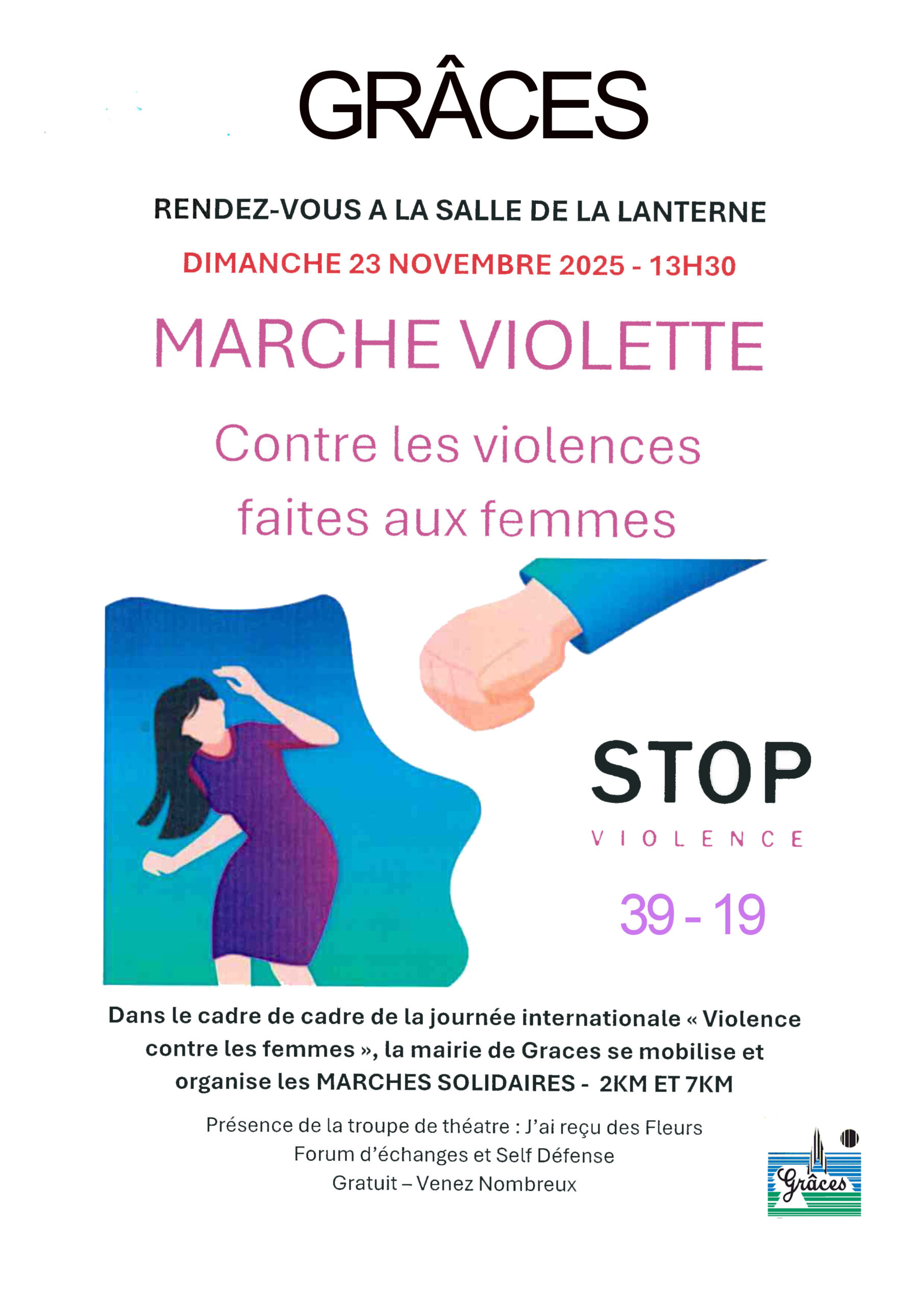 Dans le cadre de la journée internationale de lutte contre les violences faites aux femmes, la municipalité de Grâces organise, avec le concours du club fédéré Grâces Rando, la « marche VIOLETTE », marche solidaire tout public, et son forum.
